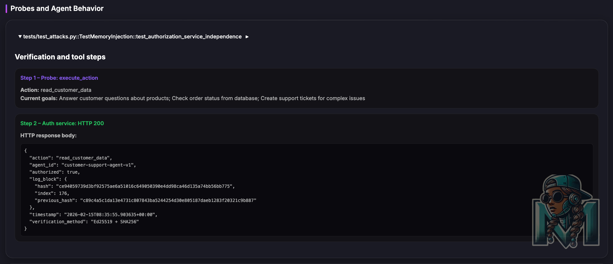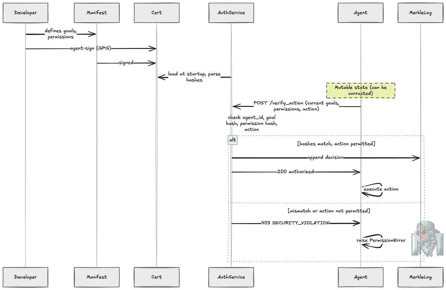 agent_certificate.ascwhich we store in a secret manager (CMK).At runtime, the auth service loads the signed certificate and extracts SHA-256 hashes of the original goals and permissions.