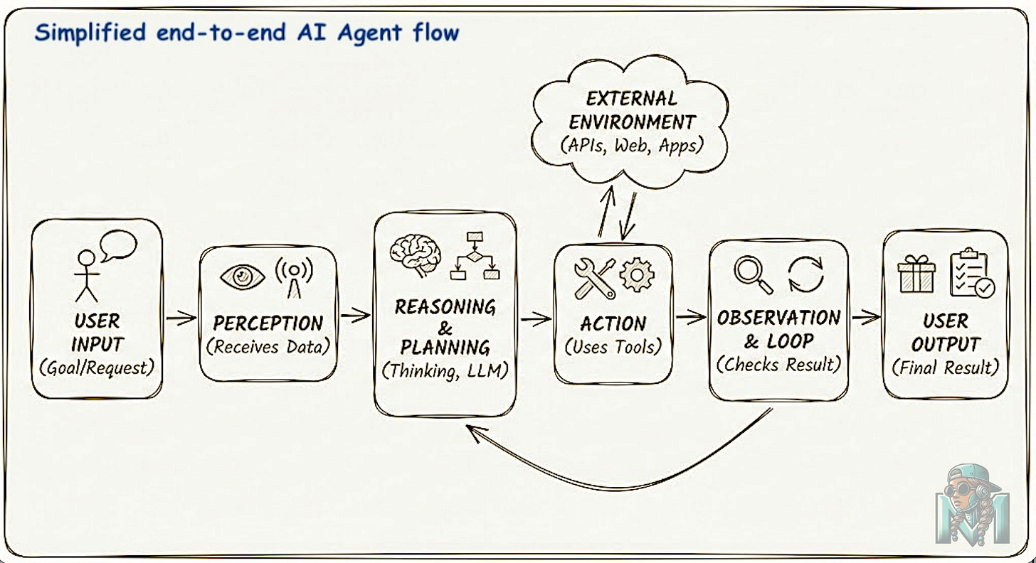 Simply put, an AI agent is an intelligent software system designed to perceive its environment, reason about how to achieve specific goals, and take autonomous actions to fulfill those objectives.
